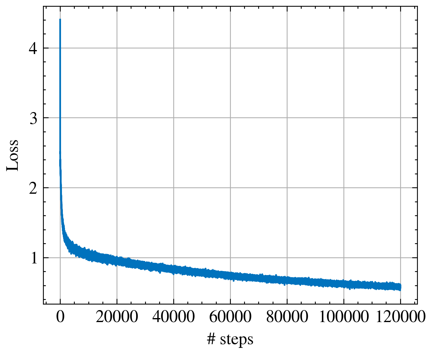 torch.optim.Adam(self.model.parameters(), lr=3e-4)I trained for only 10% of an epoch, with 120,000 steps, which took about 8 hours on my personal computer GPU.